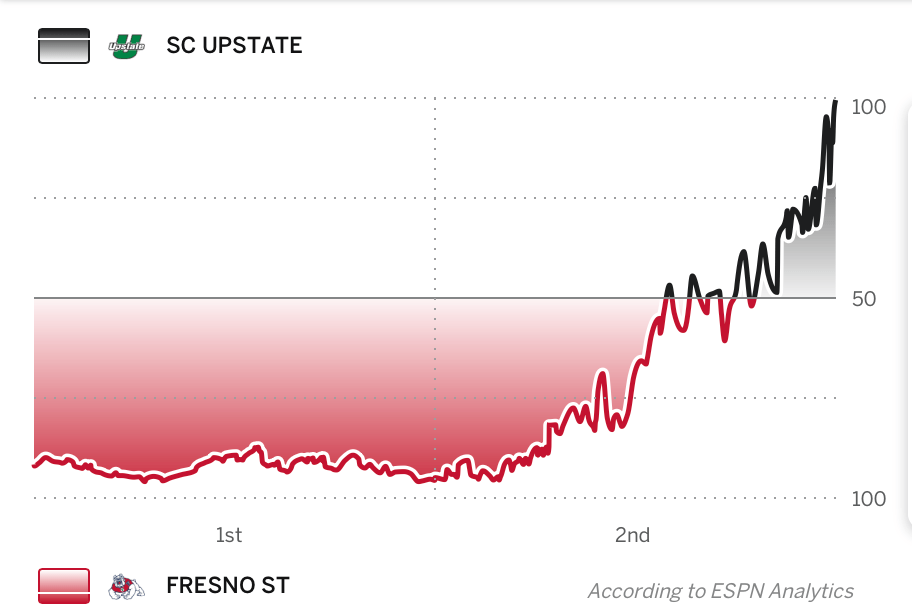 The disastrous start to the Mountain West’s season continued into night three, as the Bulldogs fell at home to USC Upstate. The Spartans stormed back from an 11-point second-half deficit, completing one of the more intriguing early-season comebacks. (And yes — the win probability chart tells the story perfectly.)