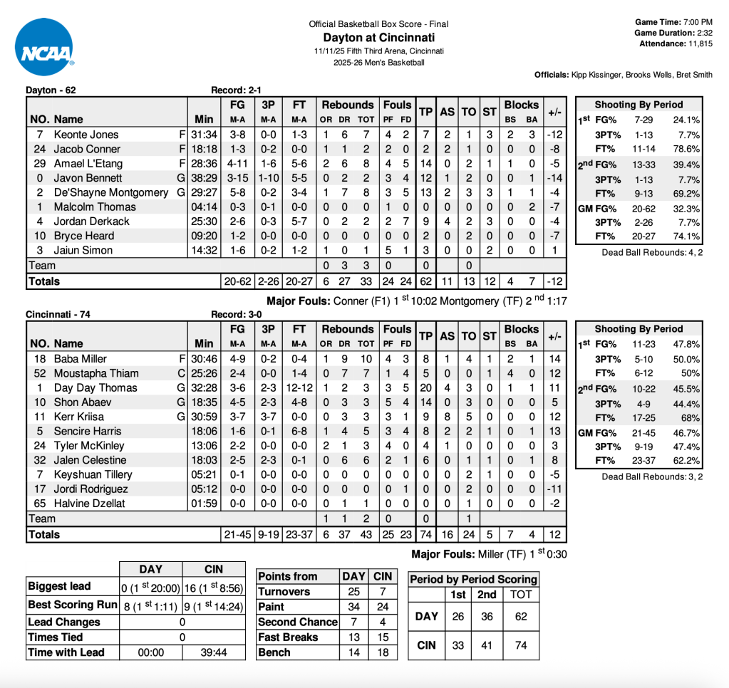The crowd deserves serious credit. The 11,815 in attendance were electric from start to finish, and the Flyers’ faithful also traveled well, as expected. In the end, though, the talent gap between the Bearcats and Flyers proved too much for Dayton to overcome, as UC pulled away late to move to 3–0 on the season.
