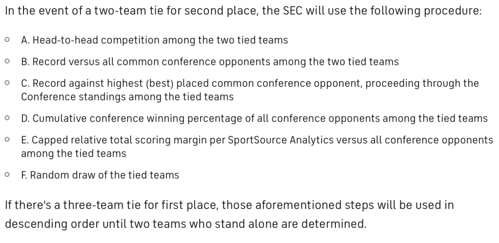 - Beat Auburn, win tiebreaker if both Ole Miss and Georgia win based off of SEC opponent winning %