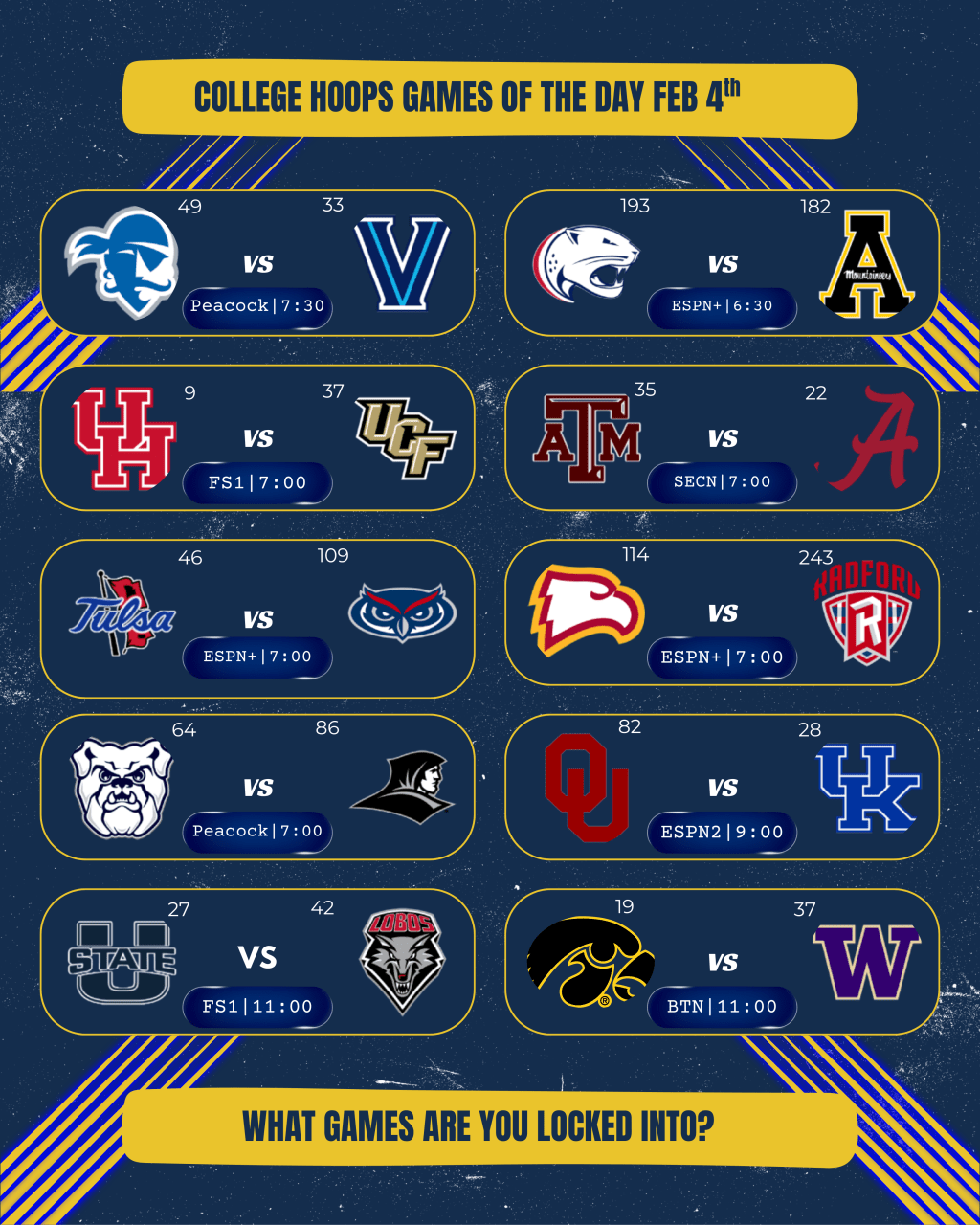Northwestern @ Illinois | 9:00, BTN The battle for the Land of Lincoln! Illinois should roll here. Northwestern is decent, but the Illini have been on another level recently and are pushing for a 1 seed.