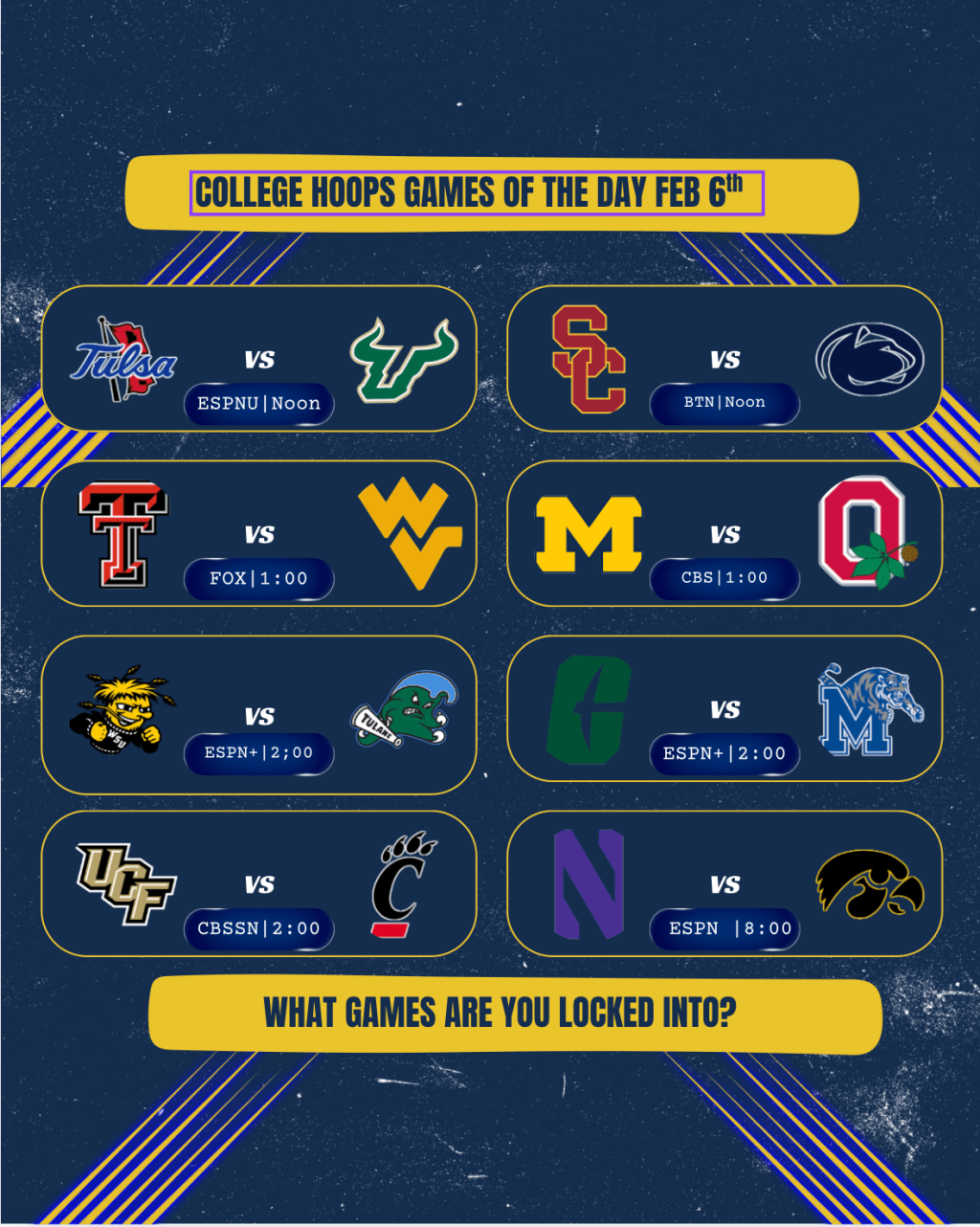 USC @ Penn State | Noon, BTN USC is favored by just 3.5 in University Park—a notoriously difficult place to play. The Trojans are projected as a 9-seed, while the Nittany Lions are currently outside the tournament looking in. USC should take this one. ✌️