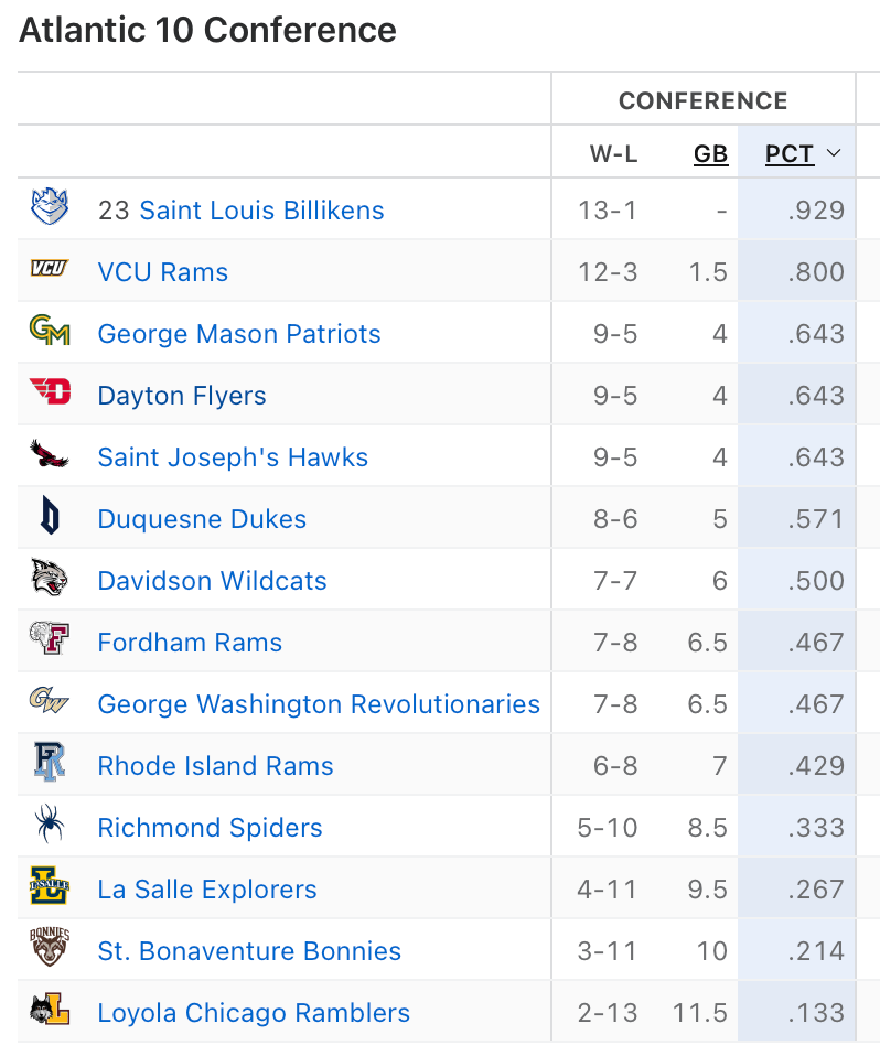 George Mason travels to Saint Joseph’s in a battle of 9-5 teams. Davidson and Duquesne will battle in Pittsburgh in a key matchup for tournament standings.