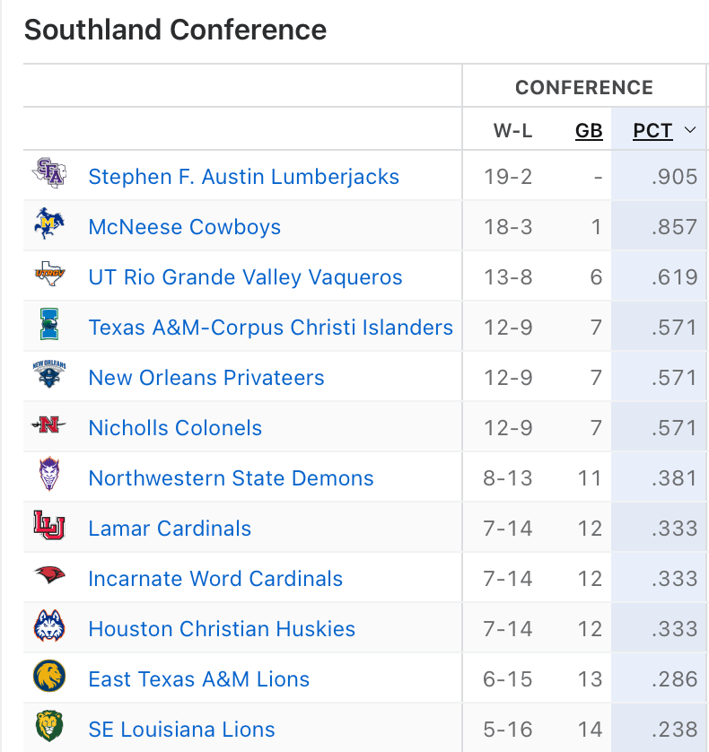 Last night of the conference this year! SFA is at Incarnate Word and the Lumberjacks will take the outright title with a win. McNeese will look to beat Nicholls and have a hope of sharing the title. Both top teams are on the road. UT Rio Grande Valley looks to maintain their 3rd place grasp with a win over NW State. New Orleans (SE LA), and Texas A&M CC (East TX A&M) will both look to get win 13. Finally, Lamar and Houston Christian will break the tie between the two 7-14 teams.