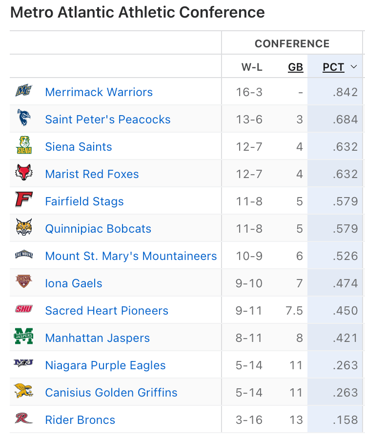 Merrimack (16-3), Quinnipiac (11-8) and Siena (12-7) will each take on lower opponents, Mount St. Mary’s travels to Fairfield in the biggest game of the day in the conference! Saint Peter’s @ Marist is a huge game in the battle for a 2.. Iona @ Manhattan are towards the middle of the conference