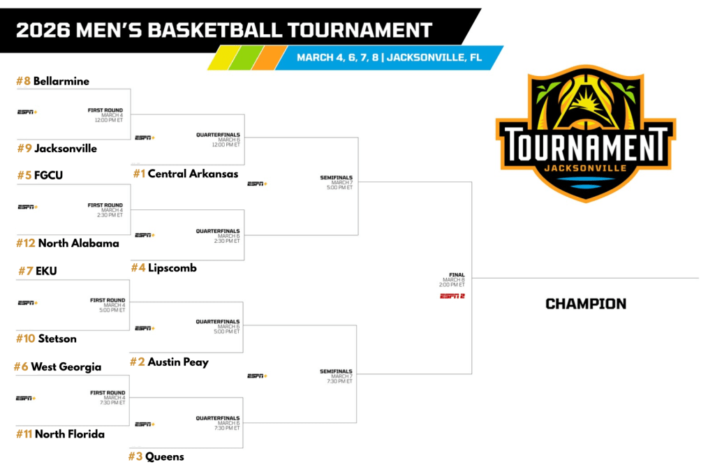 - After taking Thursday off, the conference is in full swing now. We will get to see the top seeds take the court today, starting with Bellarmine and Central Arkansas (-5.5), followed by FGCU and Lipscomb (-4.5) in the early games. The evening will see Stetson and Austin Peay (-9.5), and West Georgia and Queens (-5.5) battle. Every one of these games will be fun, and the action starts at noon from the VyStar Veterans Memorial Arena in Jacksonville! Reminder of how the bracket is setup: