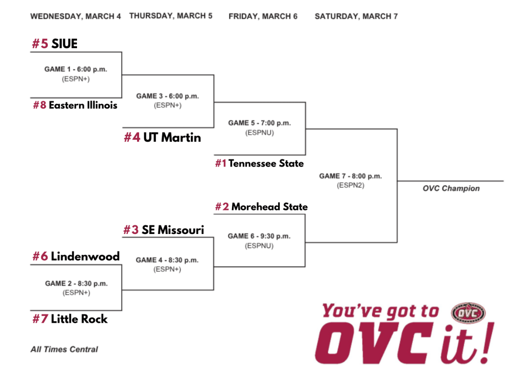 - UT Martin will battle Tennessee State in a key battle with UT Martin in the Semifinals. This feels like a complete toss-up and I’m going to be locked into this. Morehead state will face off with SEMO to close out the 3rd night in the Ford Center in Evansville.