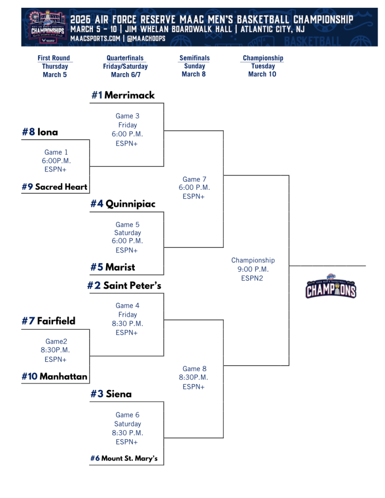 - Sacred Heart @ Merrimack kick things off at 6:00, and Saint Peters matches up with Fairfield at 8:30. Can Sacred Heart pull off a historic run?