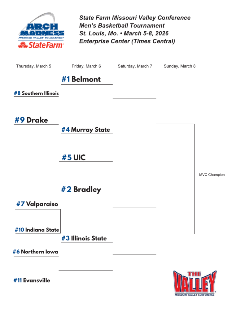 - 4 games, ranging from 1PM ET and likely ending after midnight ET! Drake and Belmont will start the night; Belmont is the heavy favorite to win the entire tournament. UIC and Murray State will battle after that in a game that I’m extremely excited to watch. UIC is competitive, but I think Murray might be the most compelling upset pick to go dancing. Murray is favored by 1.5. Valparaiso and Bradley open the night time segment in a game that should be very exciting, and Illinois State closes out the day from the Enterprise Center in St. Louis against Northern Iowa!