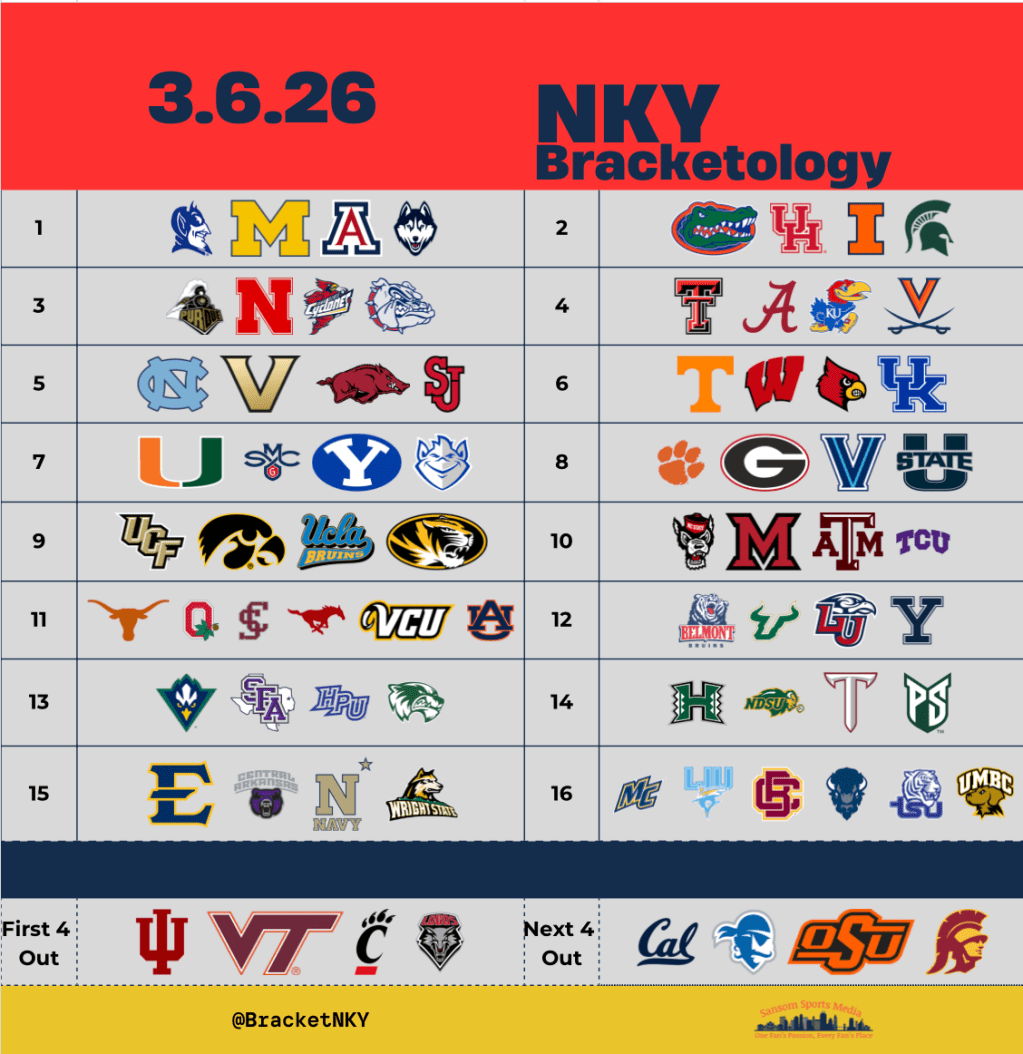 - Specific areas I’m most interested in looking at: Final two 2 seeds. (MSU/Illinois/Purdue/Nebraska/ISU). The order of the 4 seeds and the chances they have to move to the 3 line. The 5/6 lines have gotten a lot of my attention so far this week. I think I’ll leave them as-is, but will briefly evaluate. The only 7 seeds I’m confident should be on the 7 line are Miami and SMC. After that, the group of BYU/SLU/Clemson/Georgia/Villanova/Utah State/UCF are pretty jumbled and all feel like 8’s. Missouri/Iowa/NC State all feel pretty solid on the 9 line, and I think UCLA is that final 10. Miami (OH) will remain on the 10 line as the divider between the field and the bubble. Though, I do think A&M/TCU/Texas are in relatively safe positions. I’m going to be really dialing into the last 5 teams in, as well as evaluating as much as aI can on the teams out.
