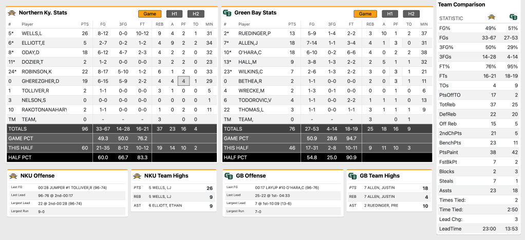 Rebounding: NKU pulled down 37 rebounds to just 25 for Green Bay. This discrepancy led to NKU taking a huge lead in the second chance aspect of this one at 21-5. They had 15 offensive rebounds to just 5 for the Phoenix.