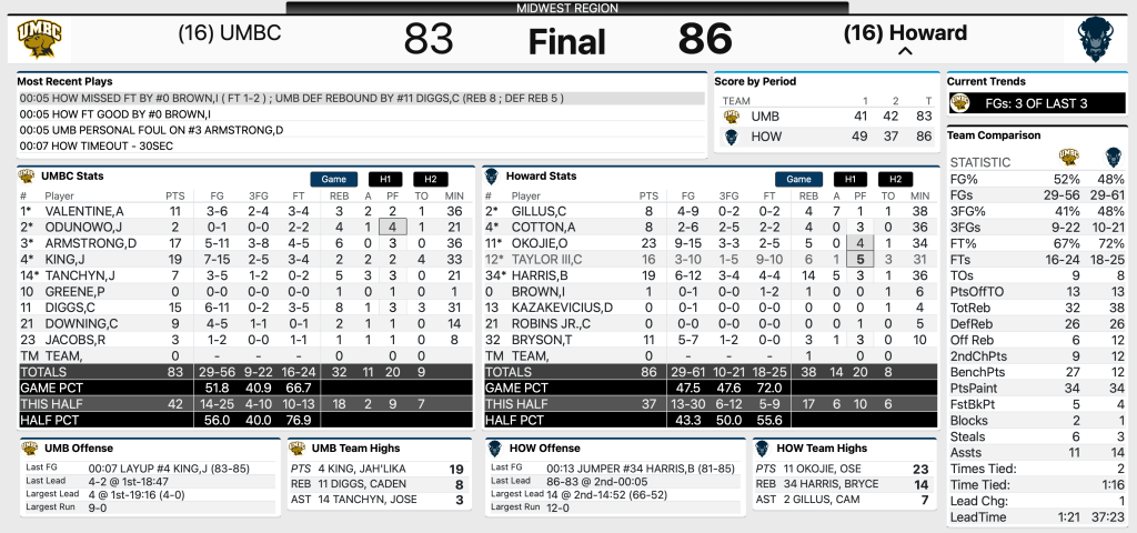 Howard took down UMBC in a thrilling matchup. I will never get tired of watching two 16-seeds duel in March with everything on the line — it’s pure cinema. Player of the game in the first matchup goes to Oso Okojie for his electric performance!