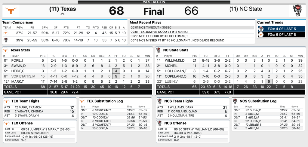 Texas, despite jumping out to a commanding first half lead, closed the first half with a 4-minute scoring drought allowing NC State to go on a 6-0 run to end the half. The game was tied 30-29 at the half. NC State took a lead with ~ 17 minutes to go in the second half off of a Paul Mcneil deep ball! After that, the game really slowed down and it was a lot more back and forth. Chendall Weaver’s offensive motor needs to be commended, his second half offensive rebounding efforts helped keep Texas ahead through the middle of the 2nd half. NC State’s comeback and the back and forth battle made for an instant classic! Texas’s Tramon Mark hit a game winning jumper to send the Longhorns home victors!